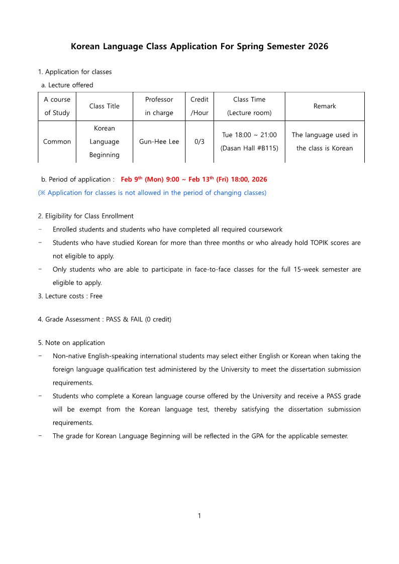Application for Korean Language Classes for Foreign Students, Spring 2026