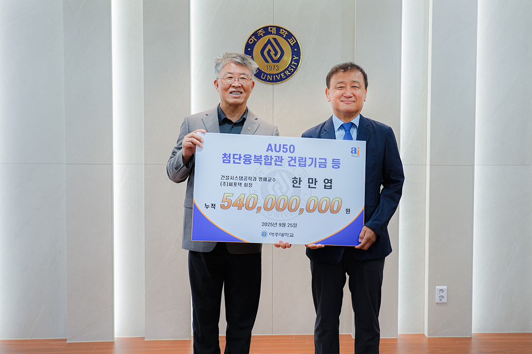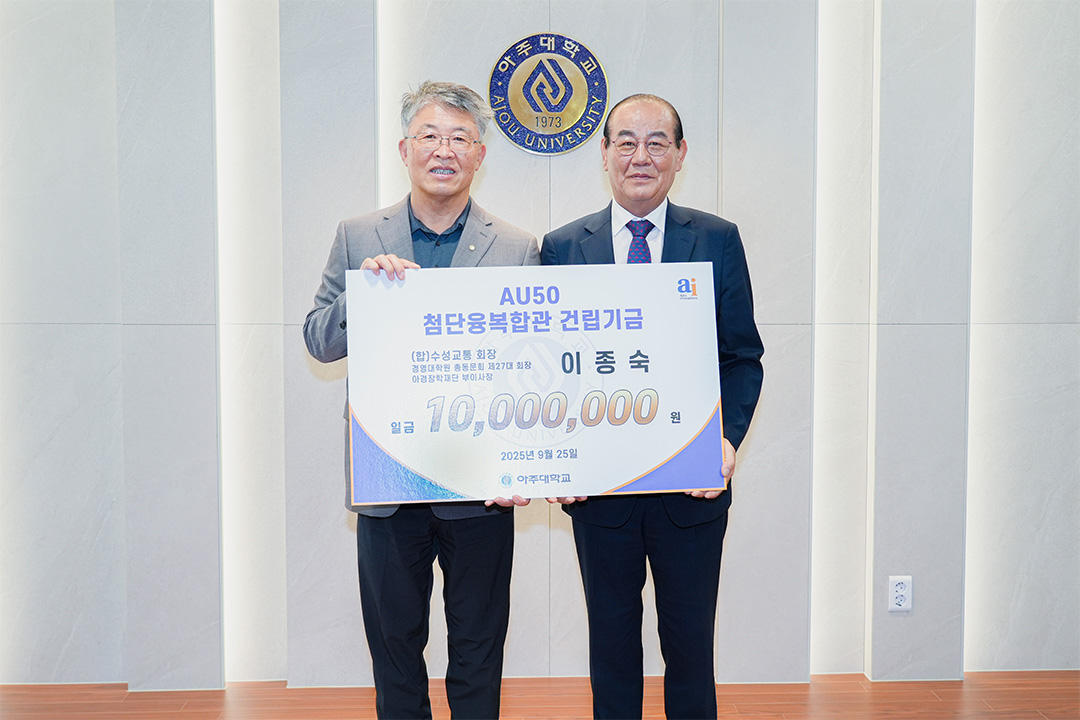 지난 25일 율곡관 총장실에서 열린 기부금 전달식 행사에는 한만엽 건설시스템공학과 명예교수, 채교석 ㈜두두인터내셔널 대표, 이종숙 수성교통 회장, 조태훈 ㈜씨엠엔바이온 대표가 참석했다. 학교에서는 최기주 총장과 장우진 교무혁신처장, 조경숙 대학발전본부장이 자리했다. 최기주 총장이 아주 가족을 대표해 감사 인사를 전하고 감사패와 예우품을 전달했다.