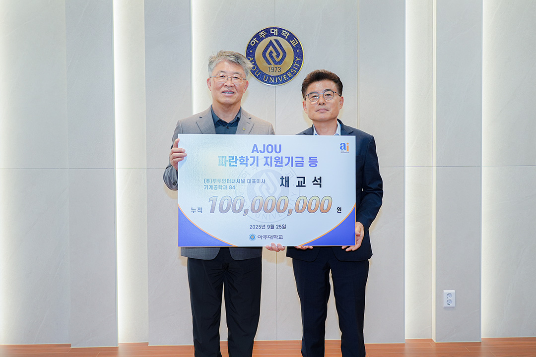 채교석 기부자는 우리 학교 기계공학과 동문(84학번)으로 ㈜두두인터내셔널 대표를 맡고 있다. 이번 기부금 전달식에서 채교석 동문은 ‘AJOU 파란학기 지원기금’으로 1000만원을 쾌척했다. 채 동문은 지난 2010년▲1-1-1 캠페인 시작으로 ▲AU50 첨단융복합관 건립기금 ▲첨단학문분야인재양성기금 등으로 지속적인 기부를 이어왔다. 채 대표의 누적 기부금은 1억원에 달한다.