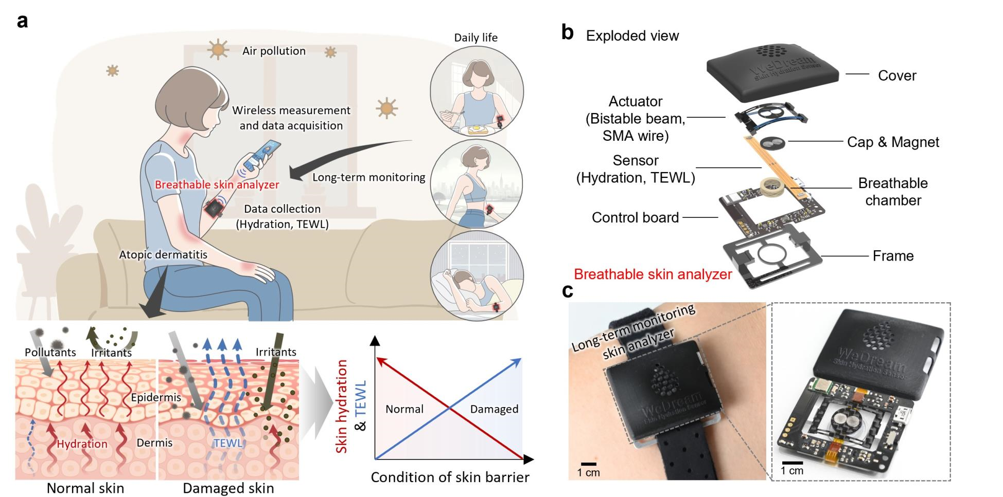 ‘피부’는 외부 환경으로부터 인체를 보호하는 첫 번째 방어선이다. 피부 장벽의 건강은 ▲수분 함량(Skin Hydration, SH) ▲경피 수분 손실(Transepidermal Water Loss, TEWL)과 같은 지표로 평가하고 있다. 그러나 이러한 데이터를 오랜 시간 동안 모니터링하면서 측정할 수 있는 착용형 기기의 부재로, 그동안은 대규모 임상을 통해서만 피부 질병과 환경 유해 인자 간의 영향을 살펴볼 수 있었다.