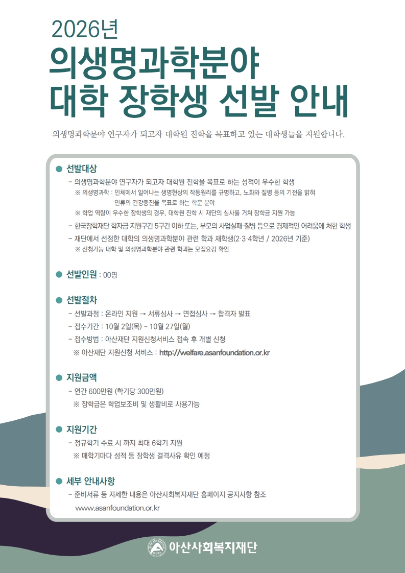[장학] [교외장학] 아산사회복지재단 2026학년도 의생명과학분야 대학 장학생 선발 안내