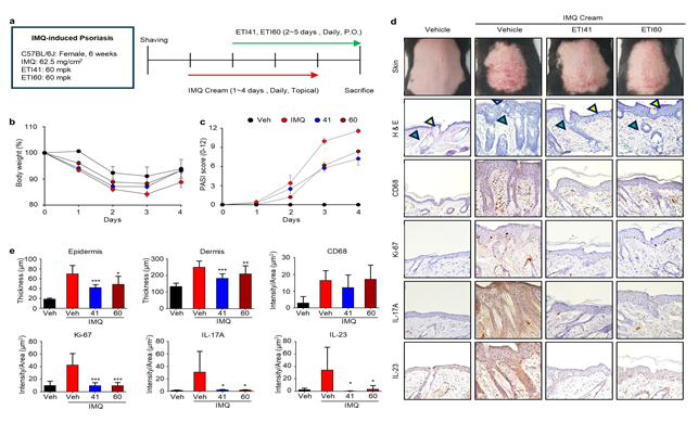 * 제일 위 그림 설명 - 아주대 연구팀이 개발한 신규 저분자 화합물 ETI41과 ETI60의 치료 효능을 자가면역질환 동물모델을 통해 설명하는 이미지. 건선 모델 7주령 C57BL/6 마우스에 ETI41 또는 ETI60를 매일 60mg/kg 경구 투여한 결과, 피부 두께(표피 및 진피)가 현저히 감소했으며, 염증세포 침윤과 염증성 사이토카인(IL-17A 및 IL-23) 발현이 크게 억제됐다. 육안 및 조직학적 관찰에서 염증과 각질 증가가 완화되는 치료 효과를 분명히 확인할 수 있었다.