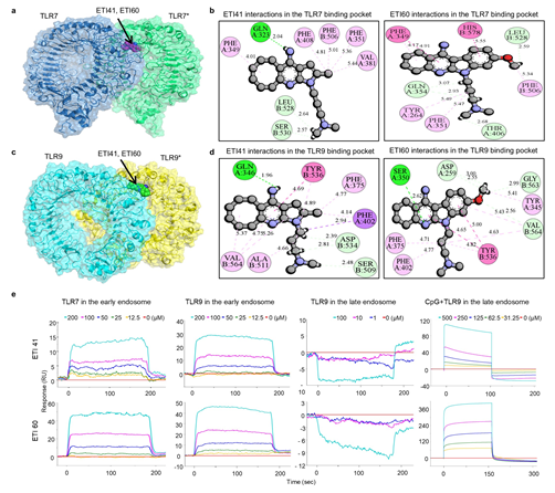 신약 후보 물질인 ETI41과 ETI60이 내재성 톨유사수용체에 어떻게 선택적으로 결합·작용하는지를 분자 수준에서 정밀하게 보여주는 이미지.